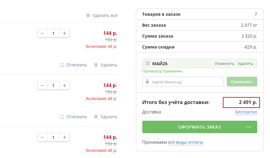 При выполении условий акции по сумме заказа, скидка по купону применяется автоматически в корзине.