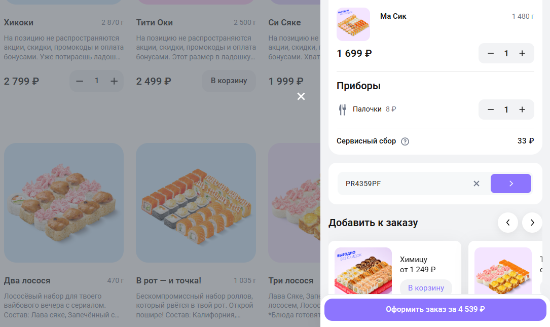 Использовать эксклюзивный код на скидку Ёбидоёби нужно при оформлении заказа. Добавьте в корзину понравившиеся блюда, сеты, а также соевый соус, палочки, имбирь. Под списком покупок найдите пустое поле «Промокод», вставьте в него кодовое слово и нажмите «Применить» – сумма заказа должна снизиться.