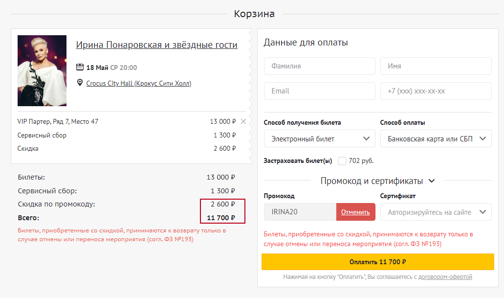Код срабатывает при покупке билетов на шоу и концерты от 2000 рублей в одном чеке. Акция действительна только на первый заказ.