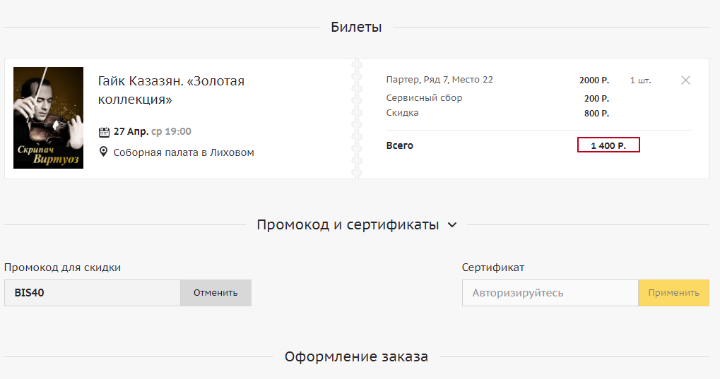 Код срабатывает при покупке билетов на шоу и концерты от 2000 рублей в одном чеке. Акция действительна только на первый заказ.