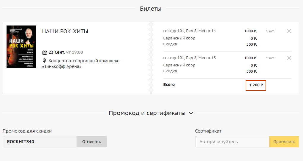 Код срабатывает при покупке билетов на шоу и концерты от 2000 рублей в одном чеке. Акция действительна только на первый заказ.