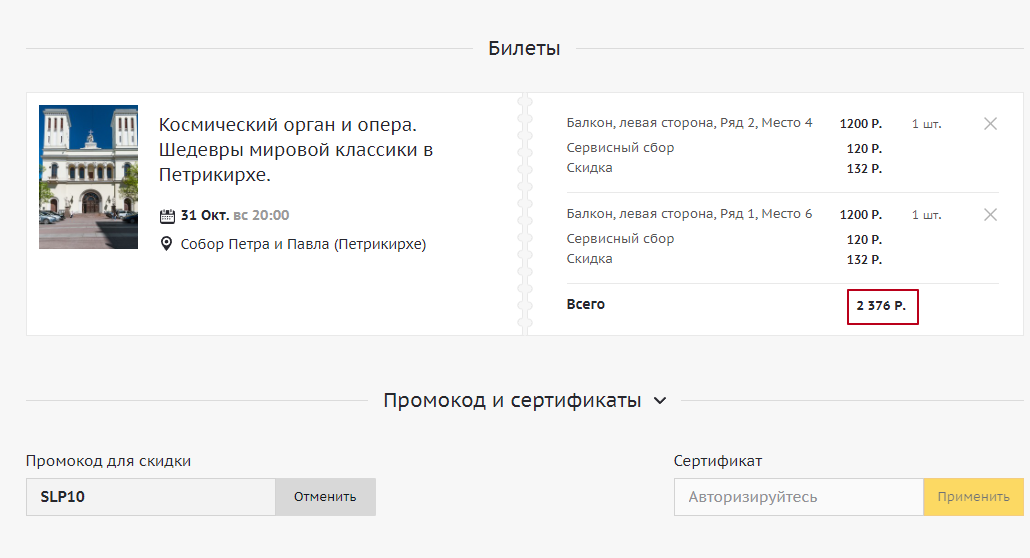 Код срабатывает при покупке билетов на шоу и концерты от 2000 рублей в одном чеке. Акция действительна только на первый заказ.
