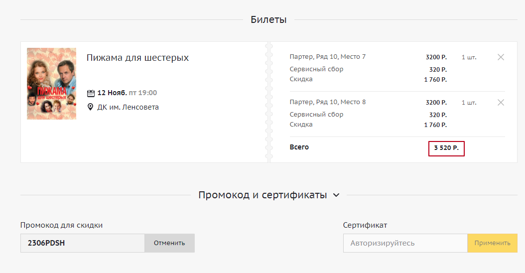 Код срабатывает при покупке билетов на шоу и концерты от 2000 рублей в одном чеке. Акция действительна только на первый заказ.