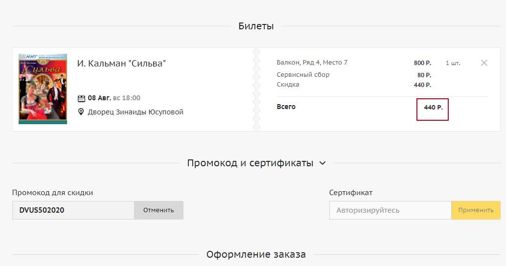 Код срабатывает при покупке билетов на шоу и концерты от 2000 рублей в одном чеке. Акция действительна только на первый заказ.