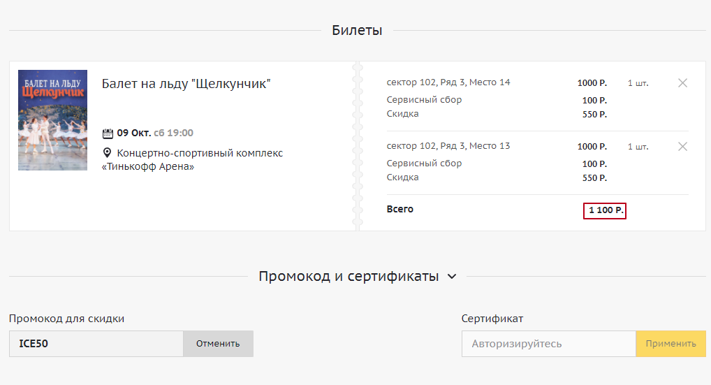 Код срабатывает при покупке билетов на шоу и концерты от 2000 рублей в одном чеке. Акция действительна только на первый заказ.