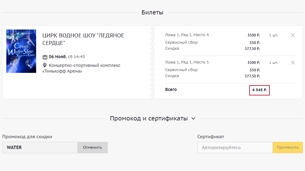 Код срабатывает при покупке билетов на шоу и концерты от 2000 рублей в одном чеке. Акция действительна только на первый заказ.