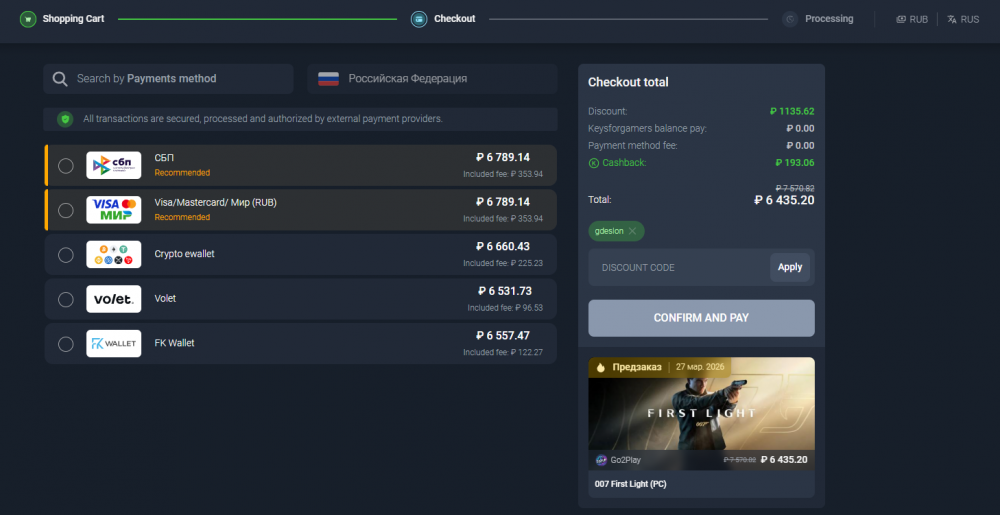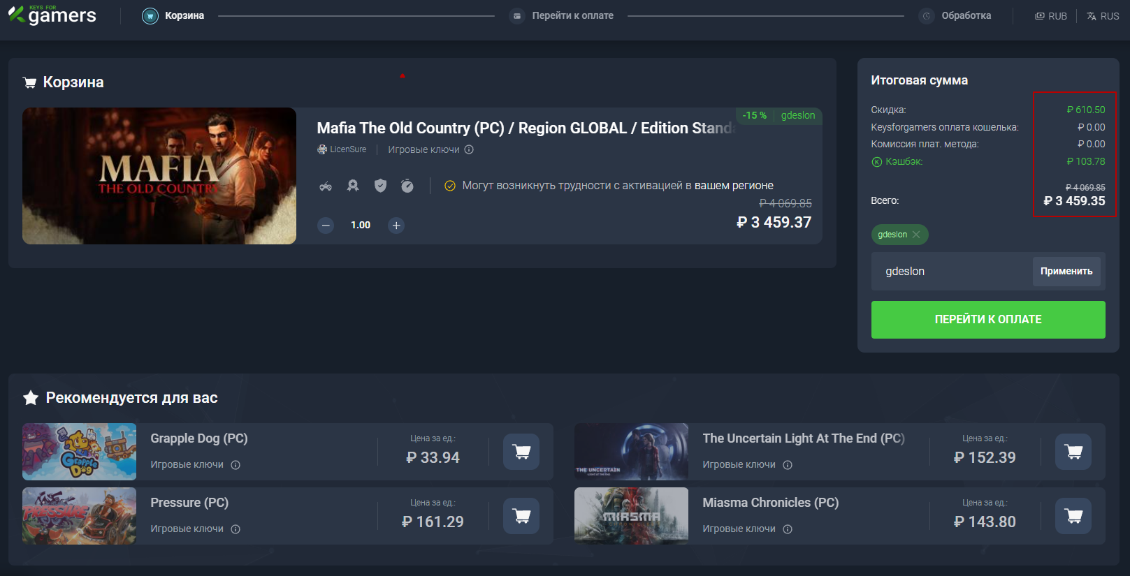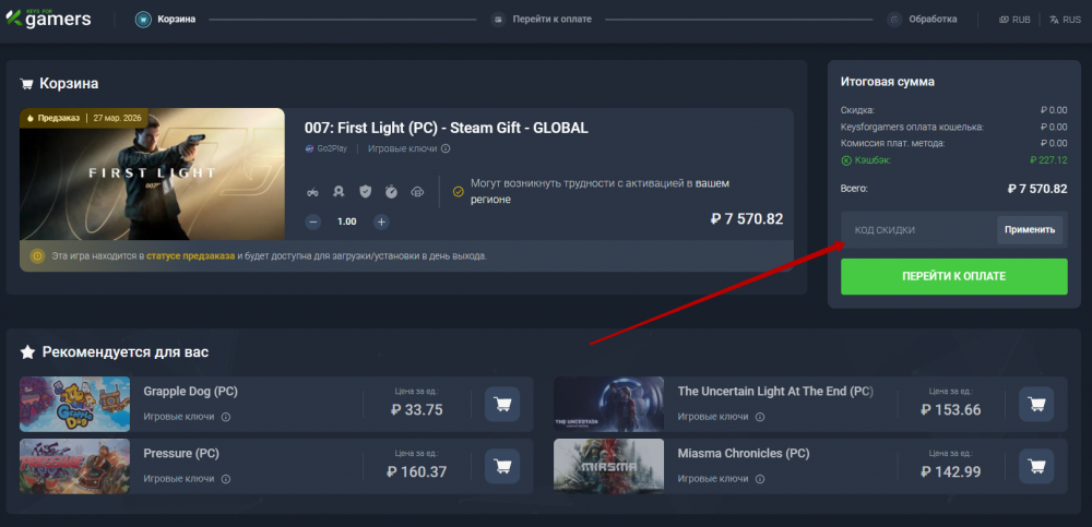 Использовать промокод Keysforgamers нужно в корзине, после выбора нужных вам цифровых товаров. Проверьте список покупок, в правом блоке найдите пустую строку «Код скидки» и вставьте кодовое слово, скопированное ранее. Кликните «Применить», а затем – «Подтведите и оплатите».
