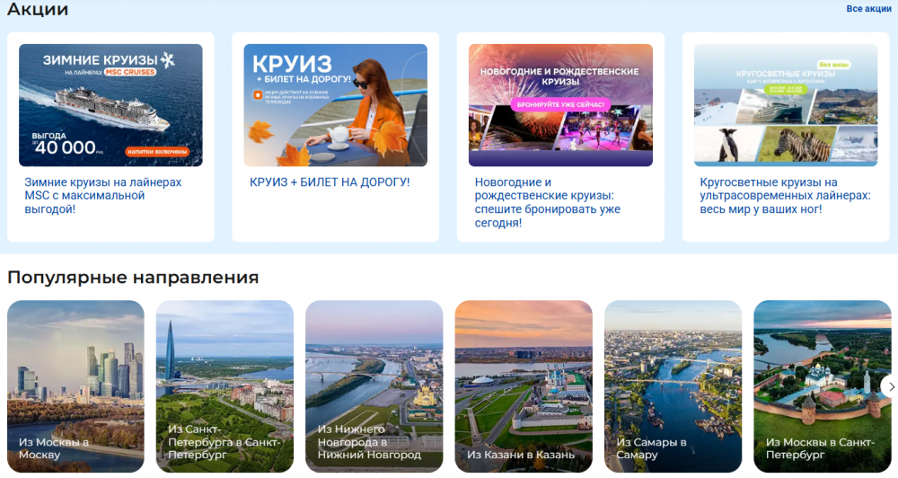 Онлайн-сервис cruise.ru предлагает морские круизы по Азии, Ближнему Востоку, Средиземному морю, Балтике или Карибам, речные туры по Каме, Ладоге, Волге, Меконгу. На сайте также можно приобрести билеты на любые самолеты и поезда с оплатой российской картой. Используйте промокод Круиз ру, чтобы попасть на трансатлантический лайнер или теплоход, следующий из Москвы, Абу-Даби, Дубая, Хошимина, Каира, с максимальной скидкой. Компания следит за самыми актуальными акциями перевозчиков и подбирает для клиентов лучшие спецпредложения.