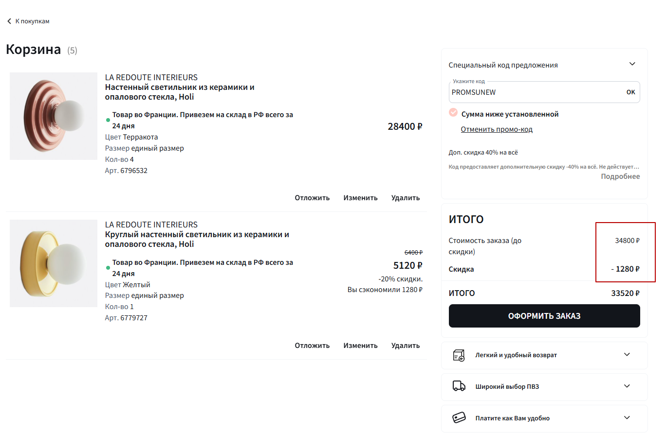 Для получения скидки в онлайн-маркете Ла Редут вам нужно сначала изучить товары в разделе «Распродажа», а затем начать делать покупки, не забыв скопировать действующий промокод. Выбирая лот, нажимайте «Добавить в корзину».