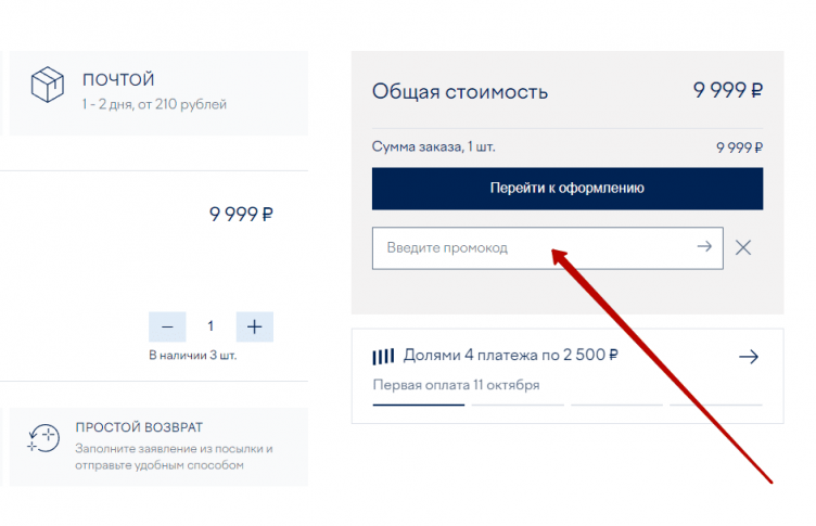 Перейдите на сайт продавца, выберите понравившуюся модель одежды или обуви, отправьте ее в корзину. Там проверьте количество товара, цвет и размер. Если все верно, то можно активировать секретный код на скидку. Для этого вставьте промокод в специальное окошко и нажмите кнопку «Применить» . Система произведет расчет дисконта и пересчитает стоимость заказа.