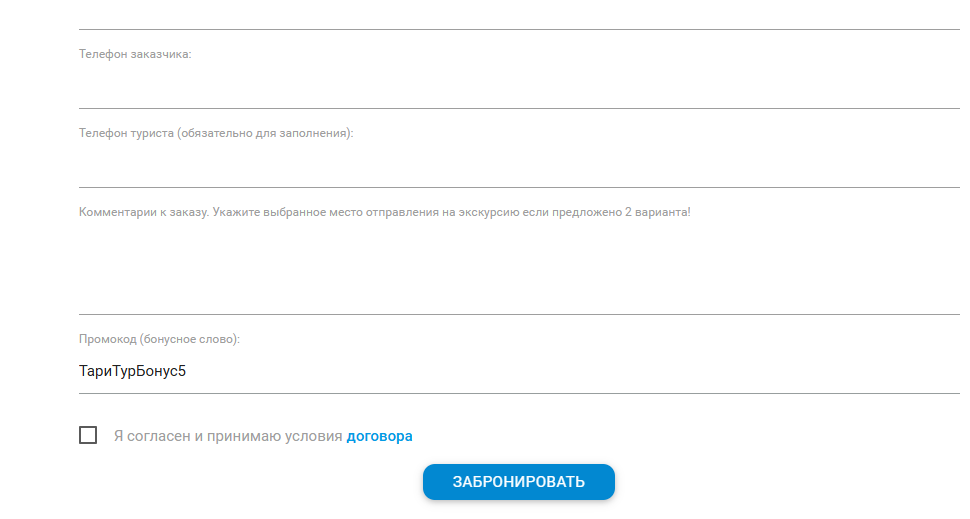 Активируйте данный купон в форме заявки на сайте с ервиса Тари Тур и получите гарантированную скидку 5% на любой тур из каталога.