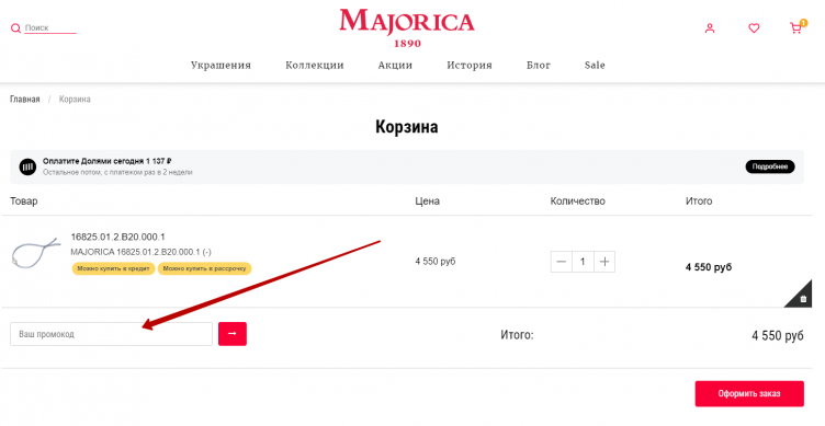 Под списком покупок вставьте скопированный ранее купон в поле «Ваш промокод». Для проверки акции и активации промокода Majorica нажмите кнопку «Применить». Если снижения стоимости заказа не произошло, попробуйте ввести код еще раз, возможно была допущена ошибка.