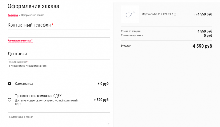 Нажмите «Оформить заказ» и перейдите на страницу с формой анкеты, где нужно указать контактный номер телефона, населенный пункт, способ доставки.