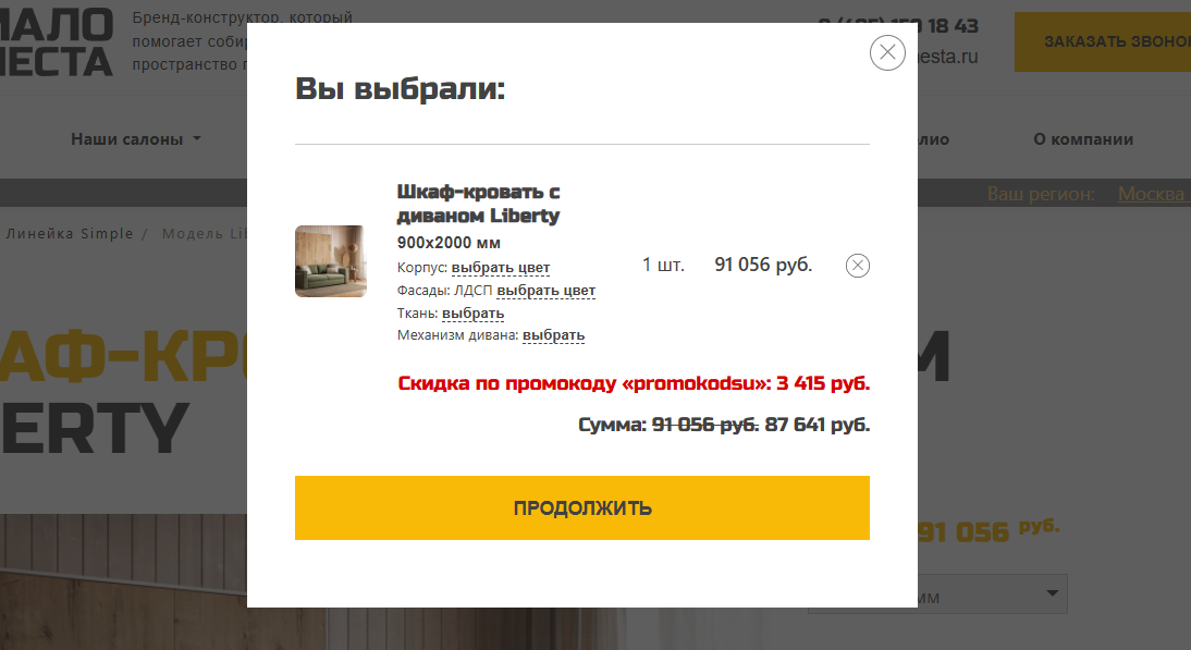 Использовать бесплатный купон с кодом Мало Места для получения скидки можно в корзине – специальная строка находится прямо под списком покупок. Вставьте сюда кодовое слово, кликните «Применить» и убедитесь, что сумма к оплате стала меньше. Проверьте параметры своего заказа (цвет корпуса, фасадов, ткань обивки, механизм) и отправьте его в обработку.