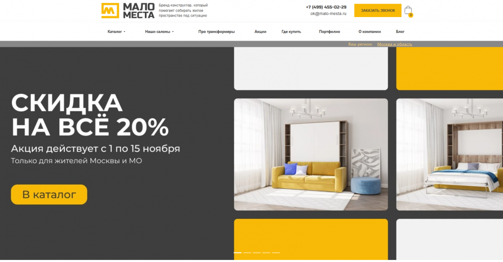 Интернет-магазин malo-mesta.ru предлагает удобную и стильную мебель с функцией трансформера, которая позволит не отказываться от полноценного спального места даже в небольшой по площади квартире. Используйте промокод Мало Места, чтобы получить скидку на встраиваемые диваны-кровати, двухъярусную мебель для детской и другие удачные решения для дома. Компания предлагает разработку бесплатного дизайн, проекта, регулярно устраивает распродажи и запускает акции для покупателей. По всей России работает сеть фирменных салонов бренда, где можно вживую увидеть и саму мебель, и образцы обивки.