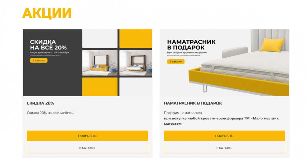 Если хотите предварительно убедиться в том, что вам подходит тот или иной образец, используйте карту сайта, выберите ближайший шоурум и посетите его перед покупкой. Рекомендуем также изучить раздел «Акции» – здесь собрана вся мебель, участвующая в распродаже.