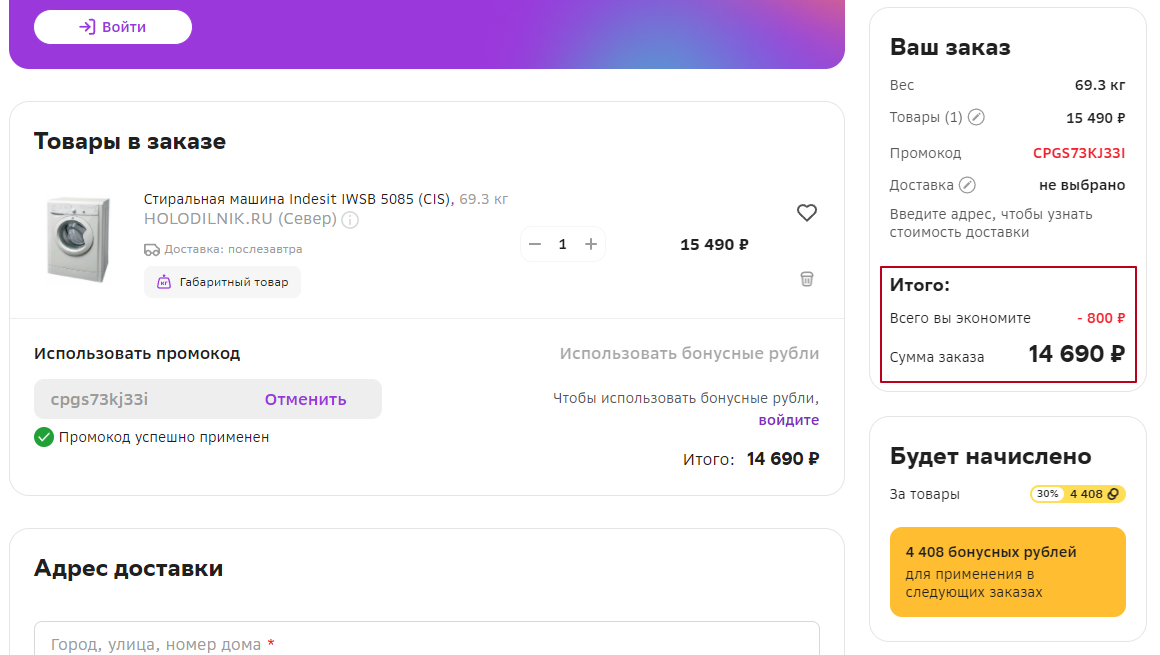 Покупайте технику из новогодней подборки, найдите промокод в карточке товара и введите его в специальное поле во время оформления заказа.