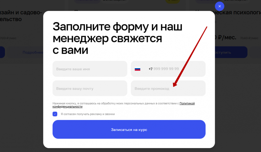 Активировать промокод МИТМ можно в заявке на консультацию – она откроется, если вы нажмете кнопку «Записаться на курс». Укажите имя, номер телефона, адрес электронной почты, вставьте скопированное кодовое слово в строку «Промокод».