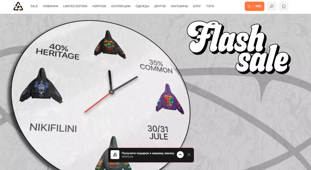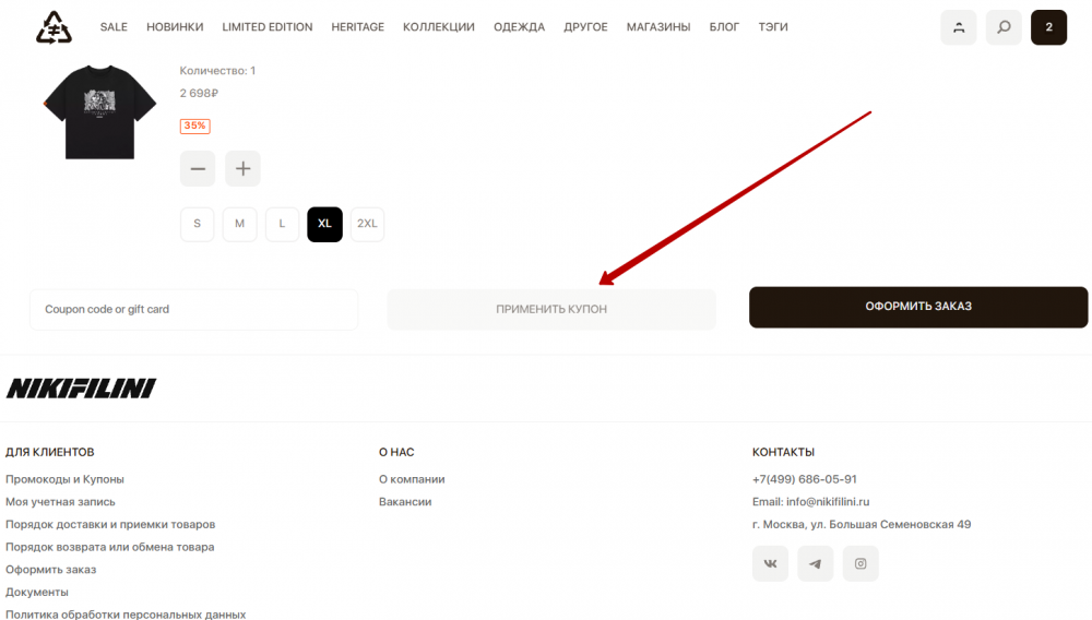 Чтобы увеличить экономию, попробуйте покрутить «Колесо фортуны» при переходе на главную страницу Nikifilini. Если предложенная скидка больше скопированного ранее промокода, используйте самое выгодное предложение. Еще один вариант – заглянуть в раздел Sale, где представлены вещи, участвующие в распродаже. Если приобретенная одежда не содержит следов брака, но подошла вам, ее можно вернуть в фирменной упаковке в течение 14 дней.