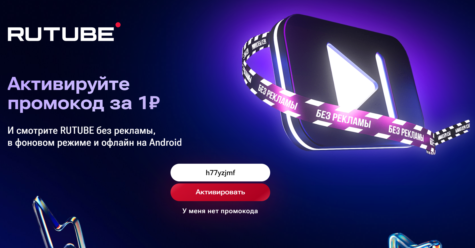 Воспользуйтесь промокодом и получите 10 дней доступа к сервису RUTUBE за 1 рубль, акция для всех пользователей без активной подписки, далее 99 рублей.