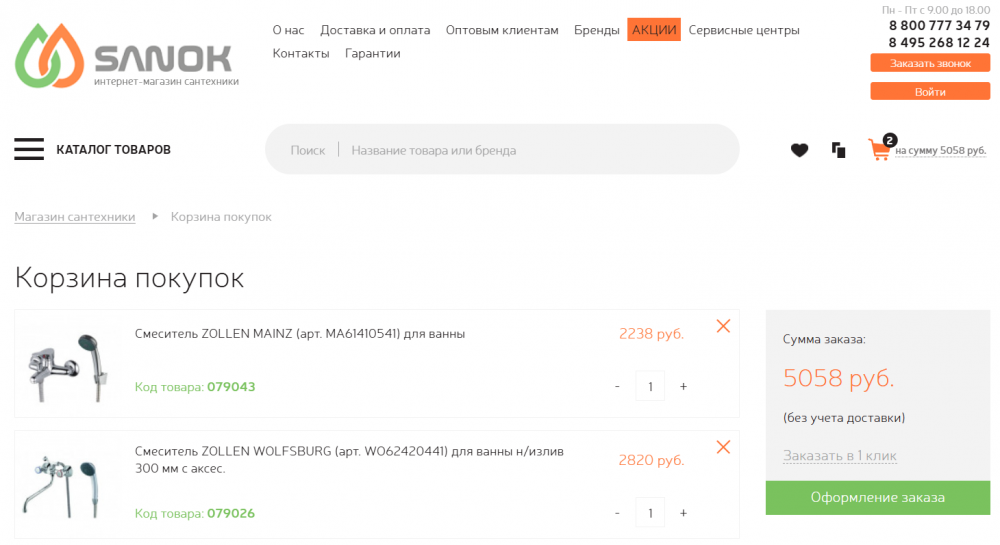 Применить промокод Sanok можно во время оформления заказа, предварительно добавив в корзину все нужные товары. Следуйте подсказкам системы, чтобы подобрать полный комплект сантехнического оборудования и аксессуаров. Проверьте список и нажмите «Оформление заказа», укажите свои контакты, адрес доставки, способ оплаты и подтвердите свое согласие с офертой.