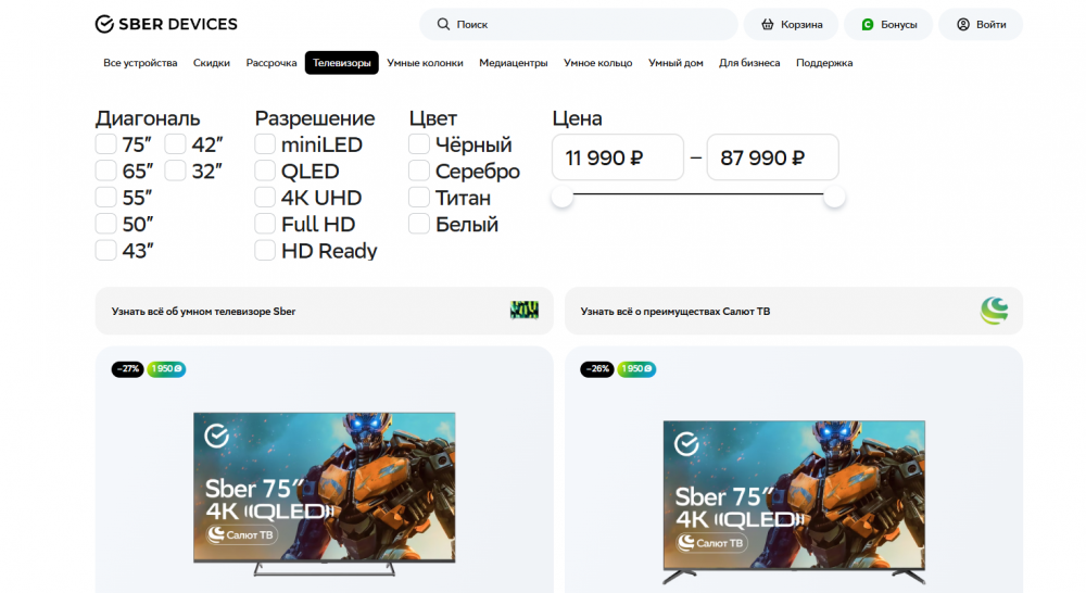 Интернет-магазин российской IT-компании полного цикла Сбер Девайсы предлагает большой выбор электроники для дома, а также различных гаджетов и аксессуаров. Используя промокод Sber Devices можно сэкономить на покупке умных устройств с виртуальным ассистентом Салют. В каталоге представлены телевизоры, умные колонки, медиацентры и системы умного дома. Все оборудование работает под управлением открытой операционной системы, доступно гарантийное обслуживание и ремонт. Заказы доставляются по РФ, в населённые пункты, входящие в зону покрытия сотрудничающих с сервисом логистических компаний.