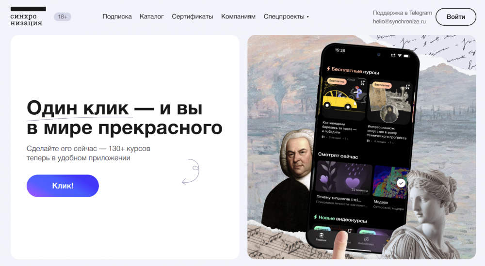 Онлайн-лекторий synchronize.ru предлагает интересные курсы, подкасты, статьи и другие полезные материалы в удобном формате, с грамотно продуманной подачей и видеорядом. Используйте промокод Синхронизация при покупке курса или оформлении подписки и получайте доступ к материалам по истории искусства, архитектуры, психологии, философии, маркетингу на самых выгодных условиях. Компания сотрудничает только с самыми авторитетными лекторами, проводит спецпроекты с партнерами, предлагая материалы самого высокого качества. На сайте доступны корпоративное и индивидуальное обучение, подарочные сертификаты и поддержка через соцсети.