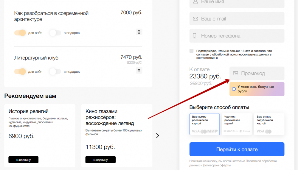 В правом блоке «Заполните форму» впишите ФИО, номер телефона и адрес электронной почты, подтвердите согласие с политикой сайта и найдите пустую строку «Промокод». Вставьте сюда бесплатный промокод, выберите способ расчета и кликните «Перейти к оплате». На новой странице будет указана цена обучения с учетом скидки.