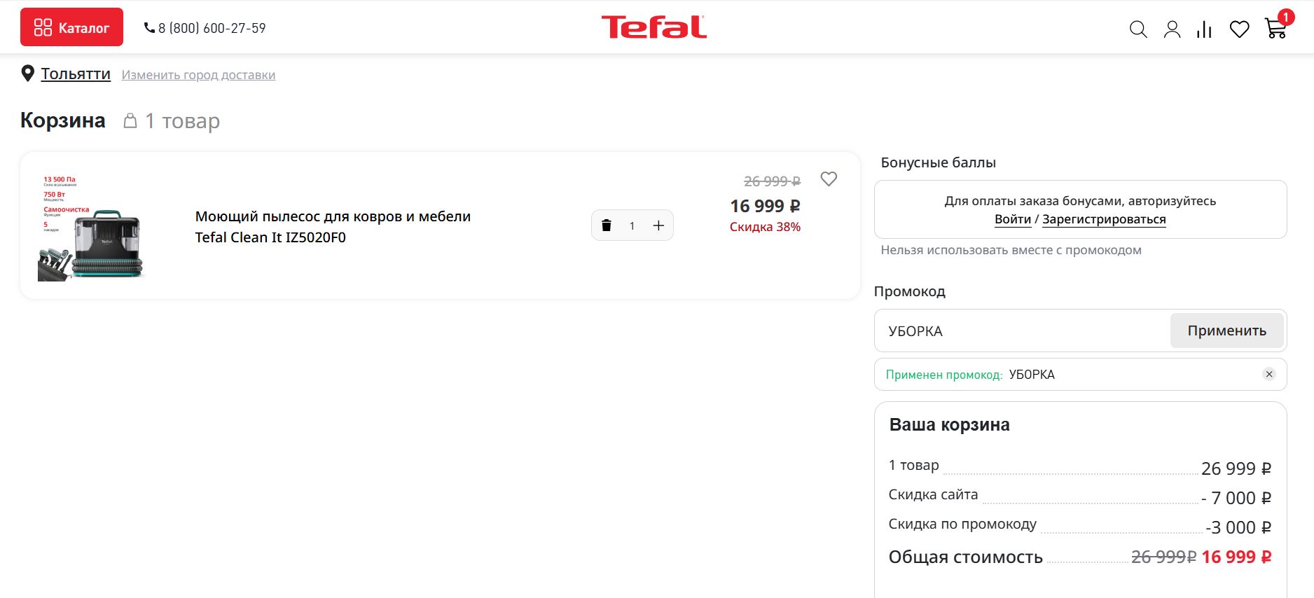 Персональный промокод со скидкой на пылесосы, паровые и гладильные системы, скороварки, аэрогрили и другую технику от Tefal доступен в личном кабинете. Не суммируется с другими акциями, баллами программы лояльности и товарами с финальной це...