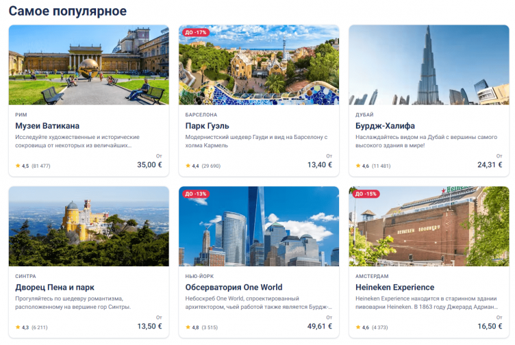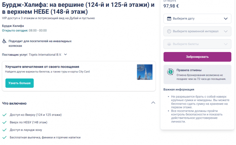 Сервис Тигетс предлагает купить билет на интересное мероприятие в любом уголке мира. Платформа помогает выбрать подходящий вариант досуга, взять напрокат транспорт, забронировать номер в гостинице не выходя из дома. Звонки в службу поддержки бесплатны даже в условиях роуминга. Удобное мобильное приложение помогает отслеживать услуги, находясь в дороге. Промокод Tiqets гарантирует скидку на путешествия и бронирование отеля. Для постоянных клиентов действует программа лояльности.
