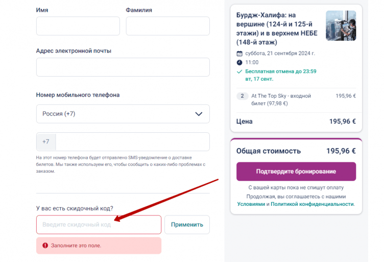 Проверьте доступность свободных мест, внесите комбинацию бесплатного купона с кодом в строку «Discount code (optional)» и активируйте его. Если срок действия секретного кода на скидку не истек, вам предоставят возможность выкупить билеты по меньшей стоимости.