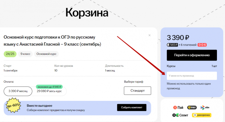 Использовать купон на скидку при покупке обучения в онлайн-школе нужно в личном кабинете, указав код в окне «Активировать промокод». Для этого скопируйте уникальный набор символов с этой страницы и перейдите сайт образовательного портала Умскул для выбора курса.