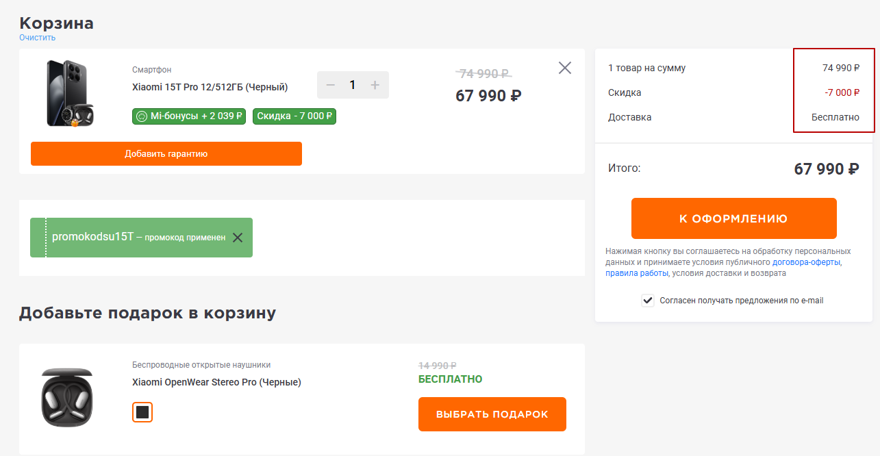 Проверяйте наличие позиций в корзине и переходите к вводу эксклюзивного купона Сяоми. Уникальный код нужно вставить в окошко под итоговой суммой заказа и нажать на стрелку. Система пересчитает цену и отобразит новую стоимость.