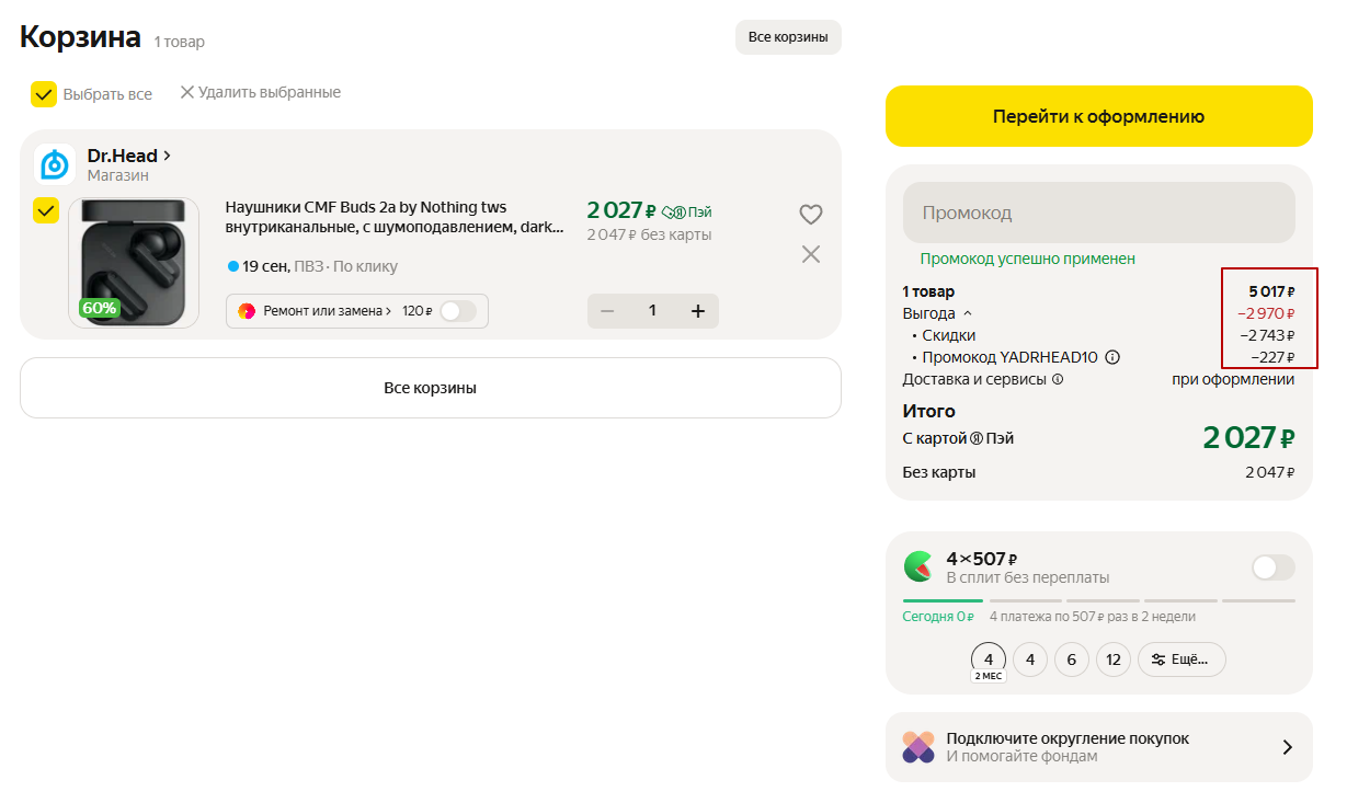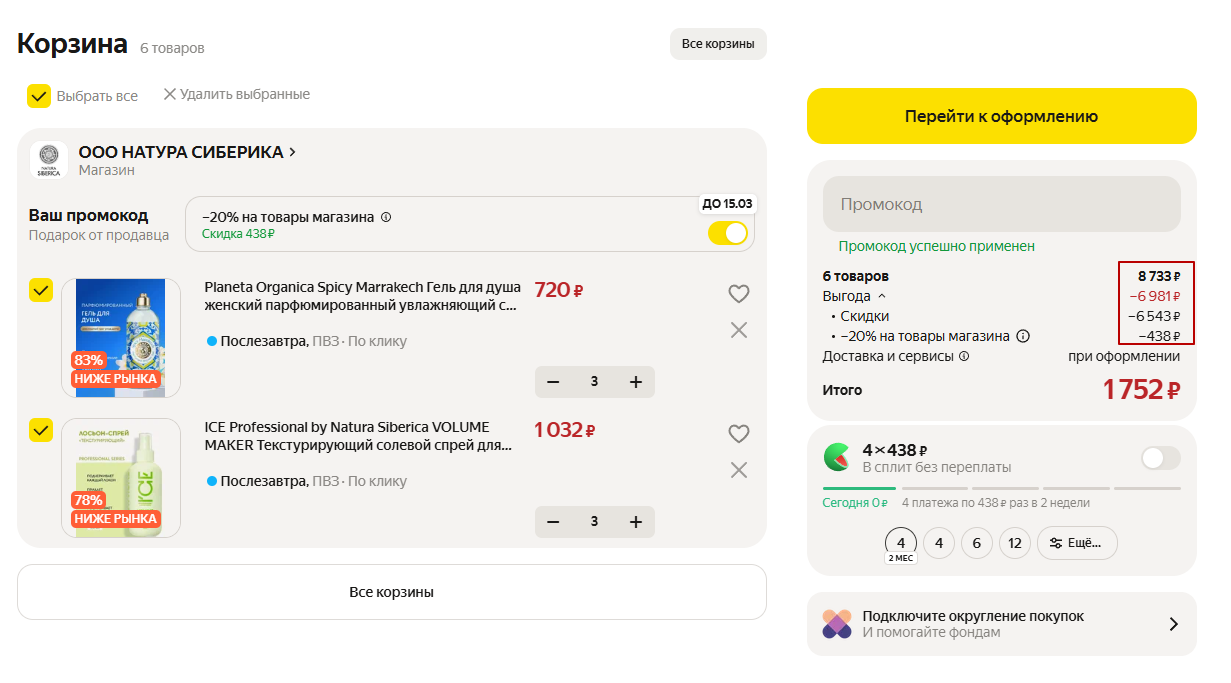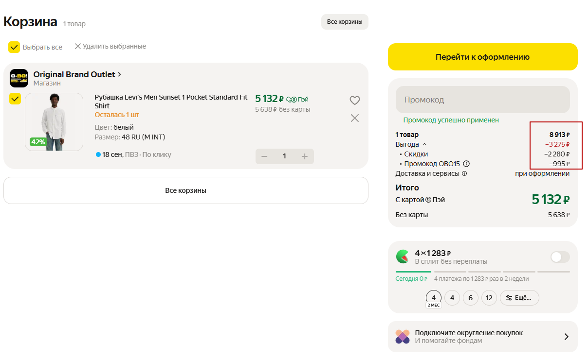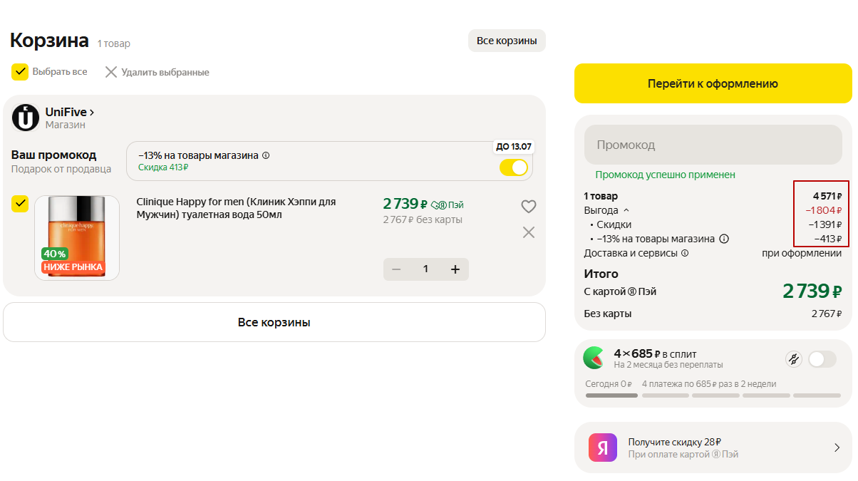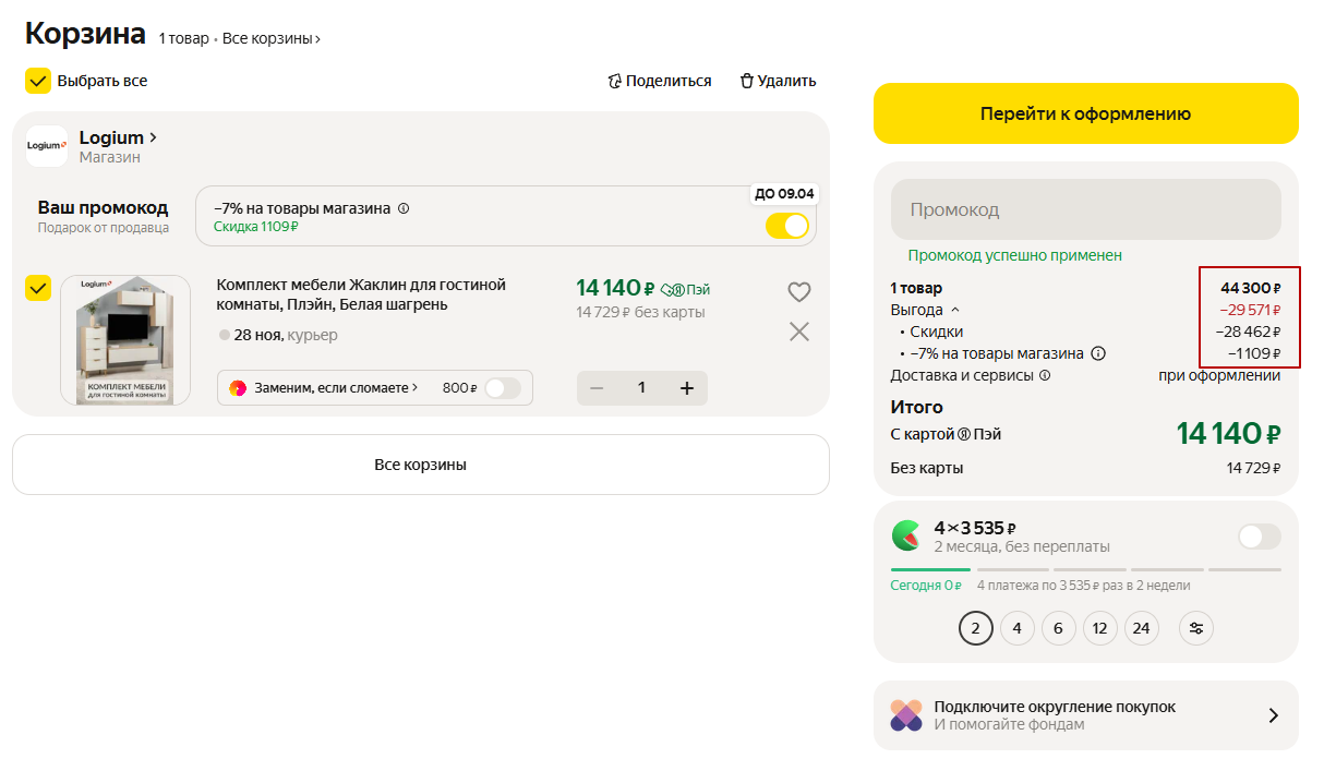 Под кнопкой «Перейти к оформлению» расположено окно для ввода купона на скидку. Вставьте промокод интернет-магазина и дождитесь снижения стоимости заказа. Если этого не произошло, повторите попытку или используйте другой код из списка.