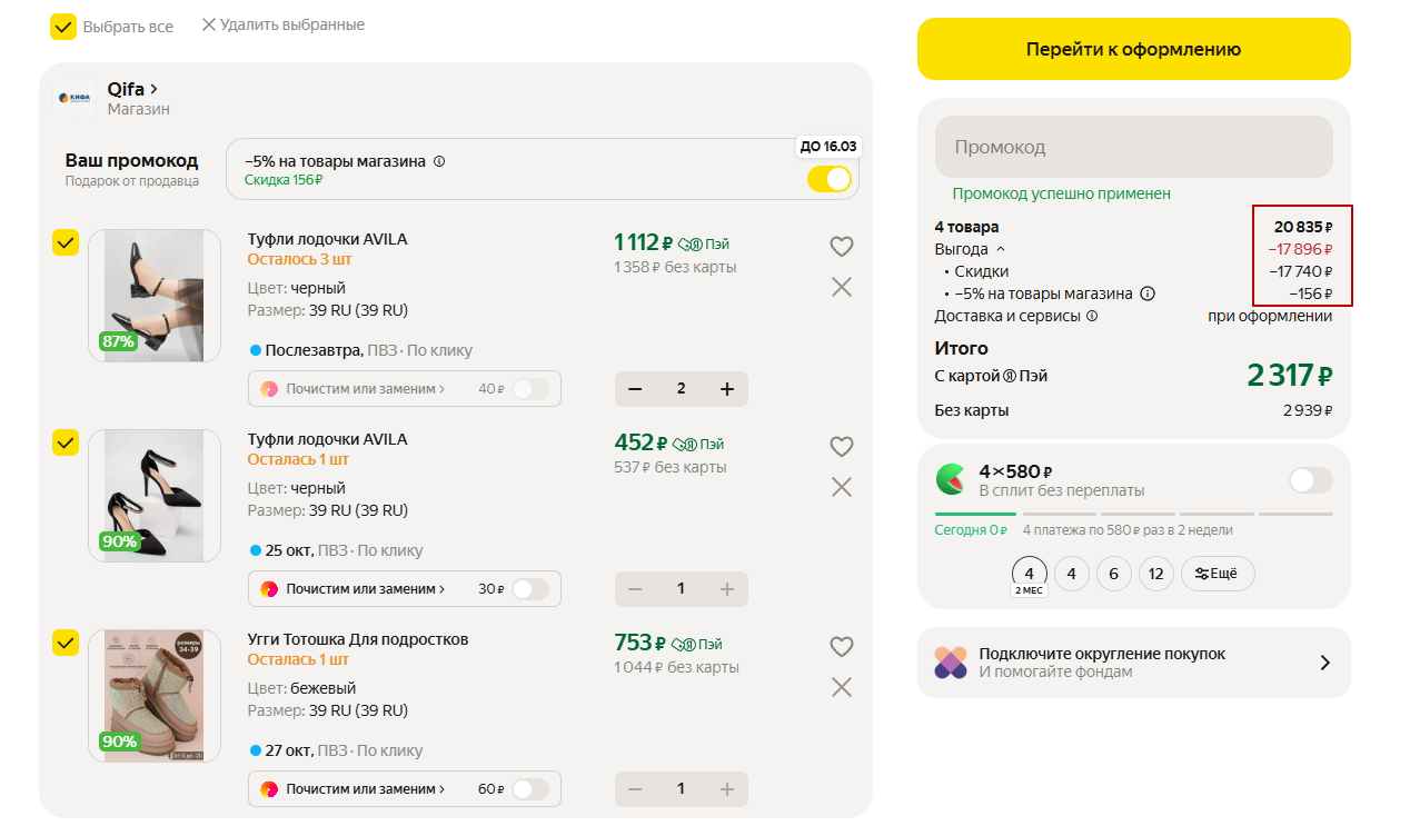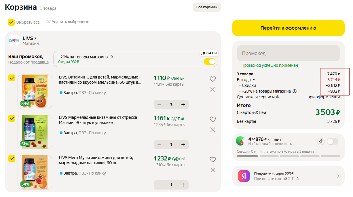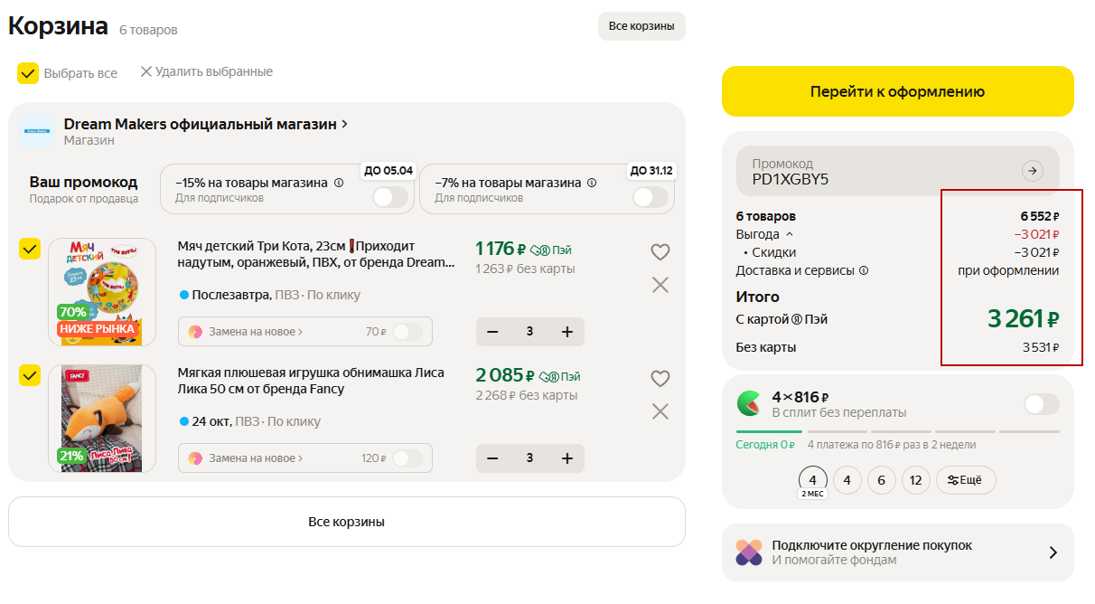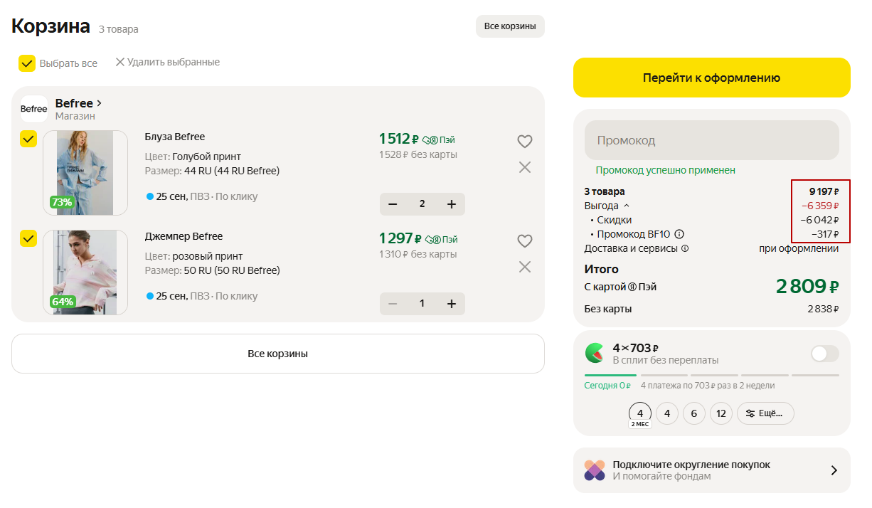 Под кнопкой «Перейти к оформлению» расположено окно для ввода купона на скидку. Вставьте промокод интернет-магазина и дождитесь снижения стоимости заказа. Если этого не произошло, повторите попытку или используйте другой код из списка.