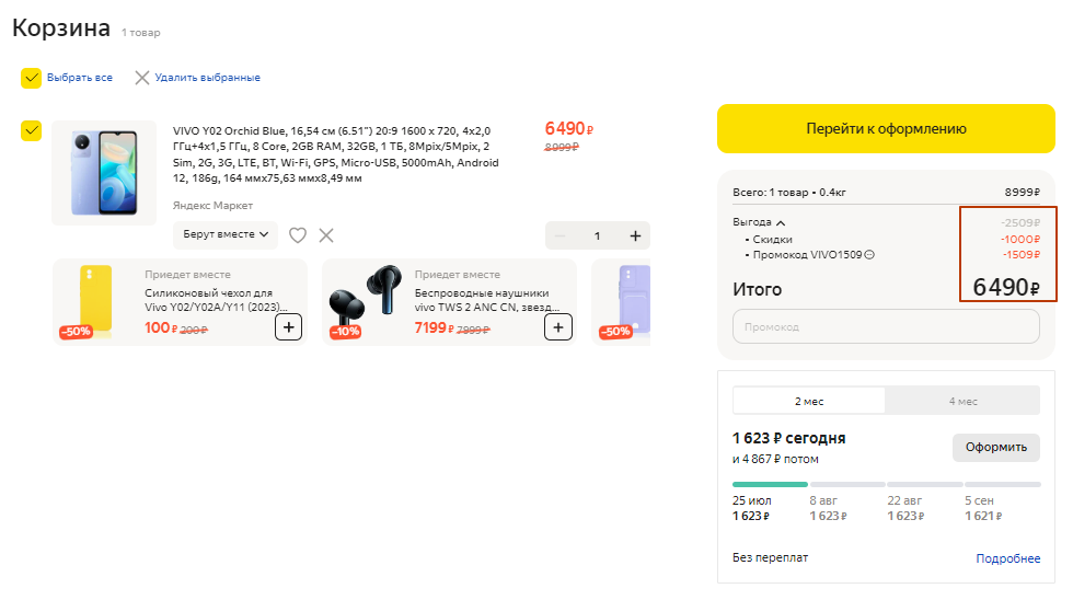 Промокод со скидкой до 1509 рублей при заказе телефонов моделей VIVO Y02 Cosmic Grey и VIVO Y02 Orchid Blue.